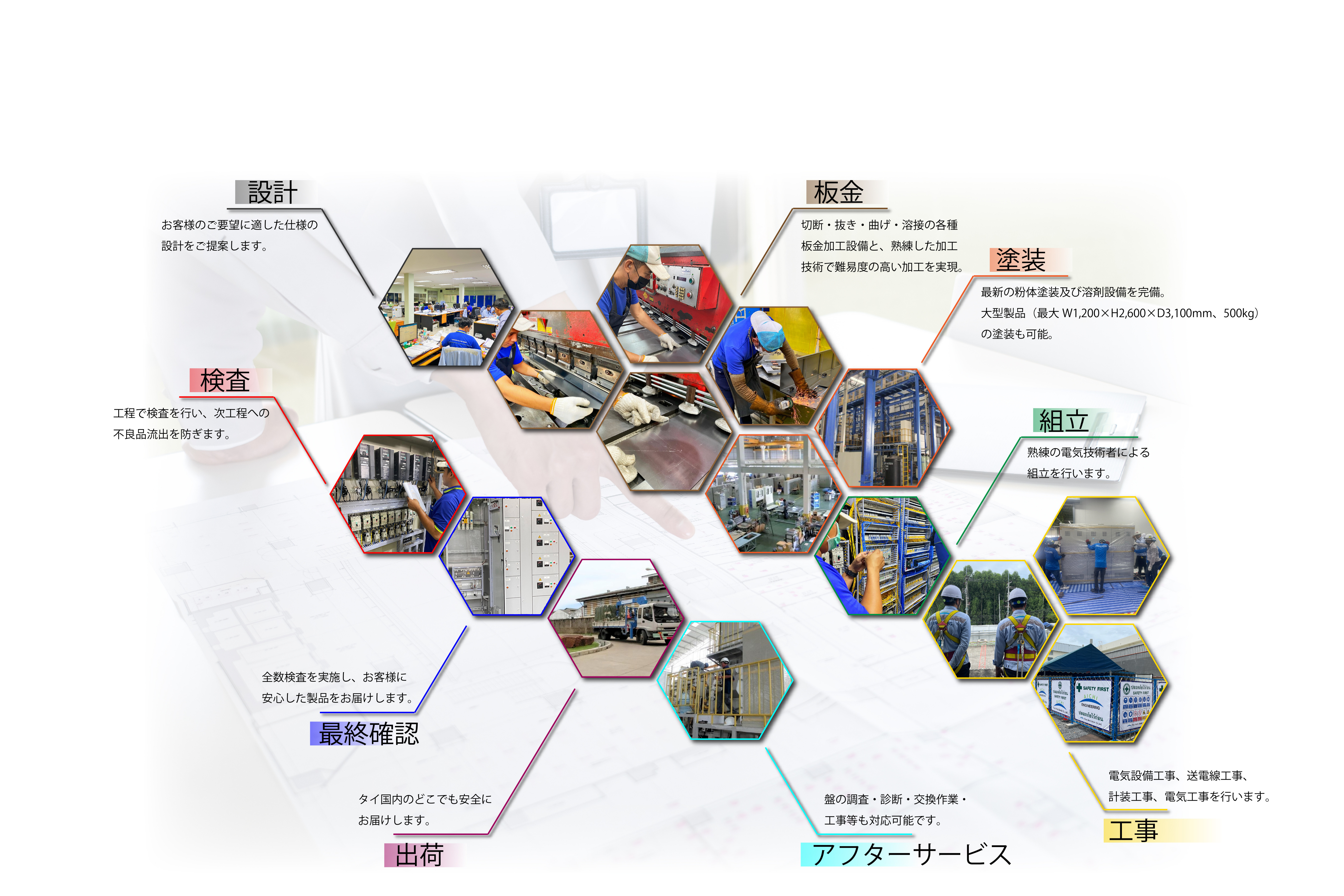 当社は、お客様のご要望に応じ、配電盤および電力システムの設計および製造、産業用電力の設置、メンテナンスおよび電気コードの配線をタイアイチではIEC、JIS、JEM、JSIA規格、品質管理システムの要件を指定するISO 9001:2015規格に従い日本人、タイ人エンジニアの綿密な監督の下で提供しています 。